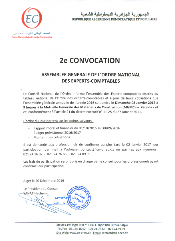 Communiqué n° 10 du 20/01/2016 "2ème Convocation Assemblée Générale Ordinaire du 08 Janvier 2017"